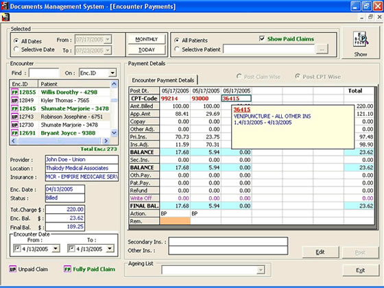 DMBI uses a batch system in order to prevent the problems of over-posting and under-posting payments from the insurance companies. All EOB batch totals are matched with the billing system's own payment report at the time of posting. This guarantees that any amount posted in the doctor's system matches “penny to penny” the checks cashed by the physician. Any amounts due to the physician from uncollected deductibles, co-pays, and coinsurance are eventually noted on patient statements which are promptly mailed out.